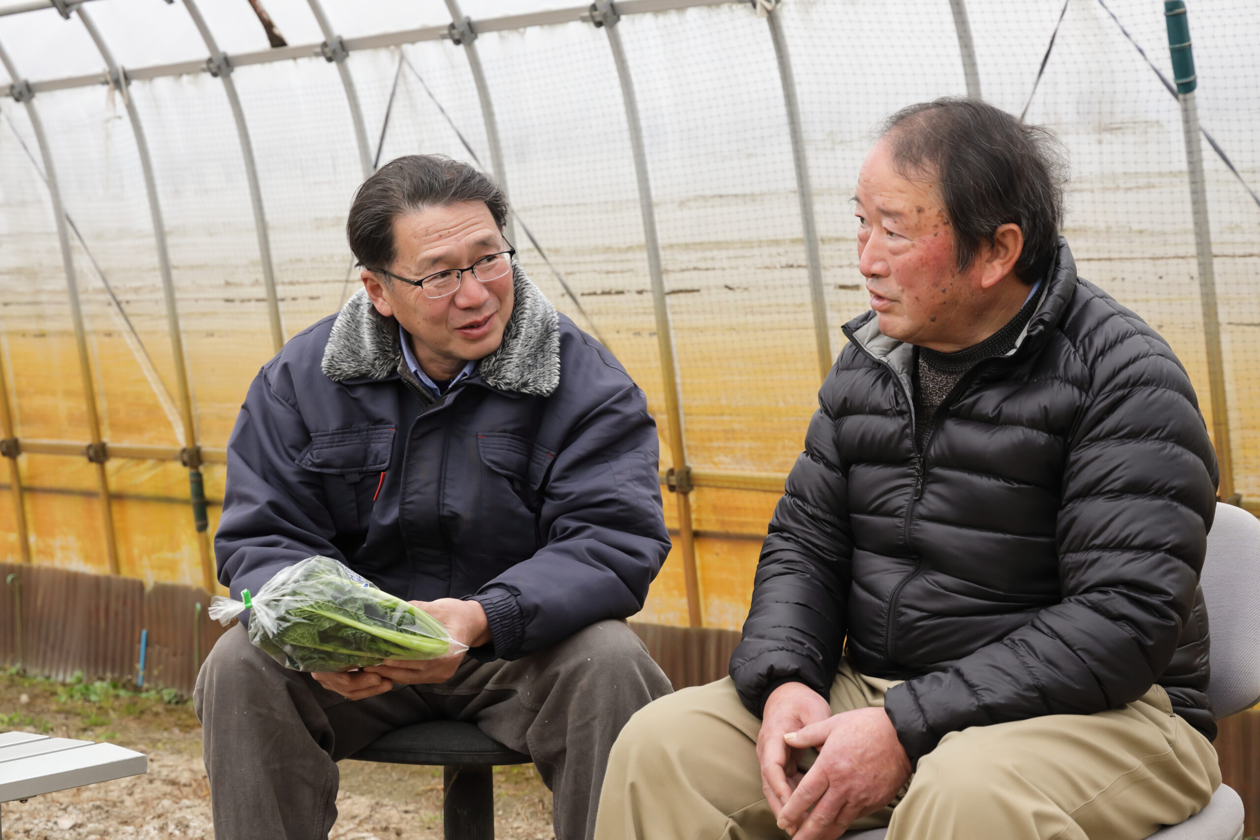 今回は、およそ10年ぶりに雪菜を育てたという伊深さんご夫妻に加え、豊富な経験からお二人に栽培のアドバイスを行った、近所に住む農家の佐々木昌孝さん(写真左)、菊地春利さん(写真右)にもお話を伺いました。