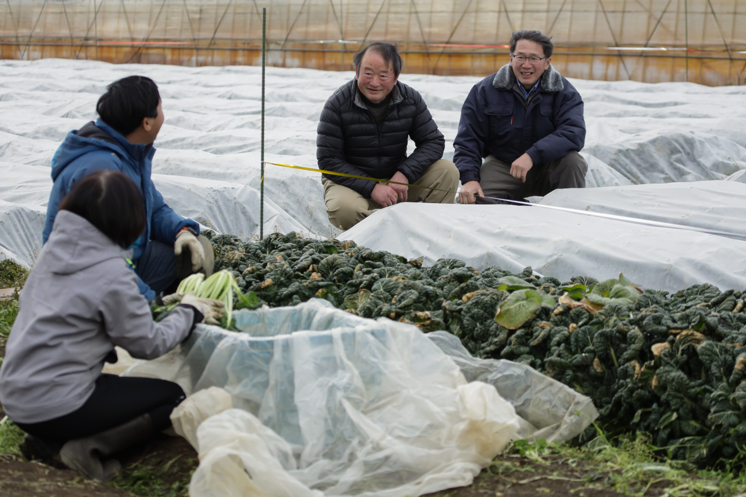 伊深さんが久しぶりにちぢみ雪菜の栽培を再開したのは、例年冬場に育てていた白菜の価格が毎年下がり続けていることから。「数年前から他のものを作りたいと考えていました。その中で農協から雪菜の栽培を提案され、心配はありましたが挑戦することにしました」と光さんは語ります。「この辺りでは、ちぢみ雪菜を育てている農家が多いんですよ」と佐々木さん。光さんは今でも時折、佐々木さんと菊地さんに相談しているといいます。
