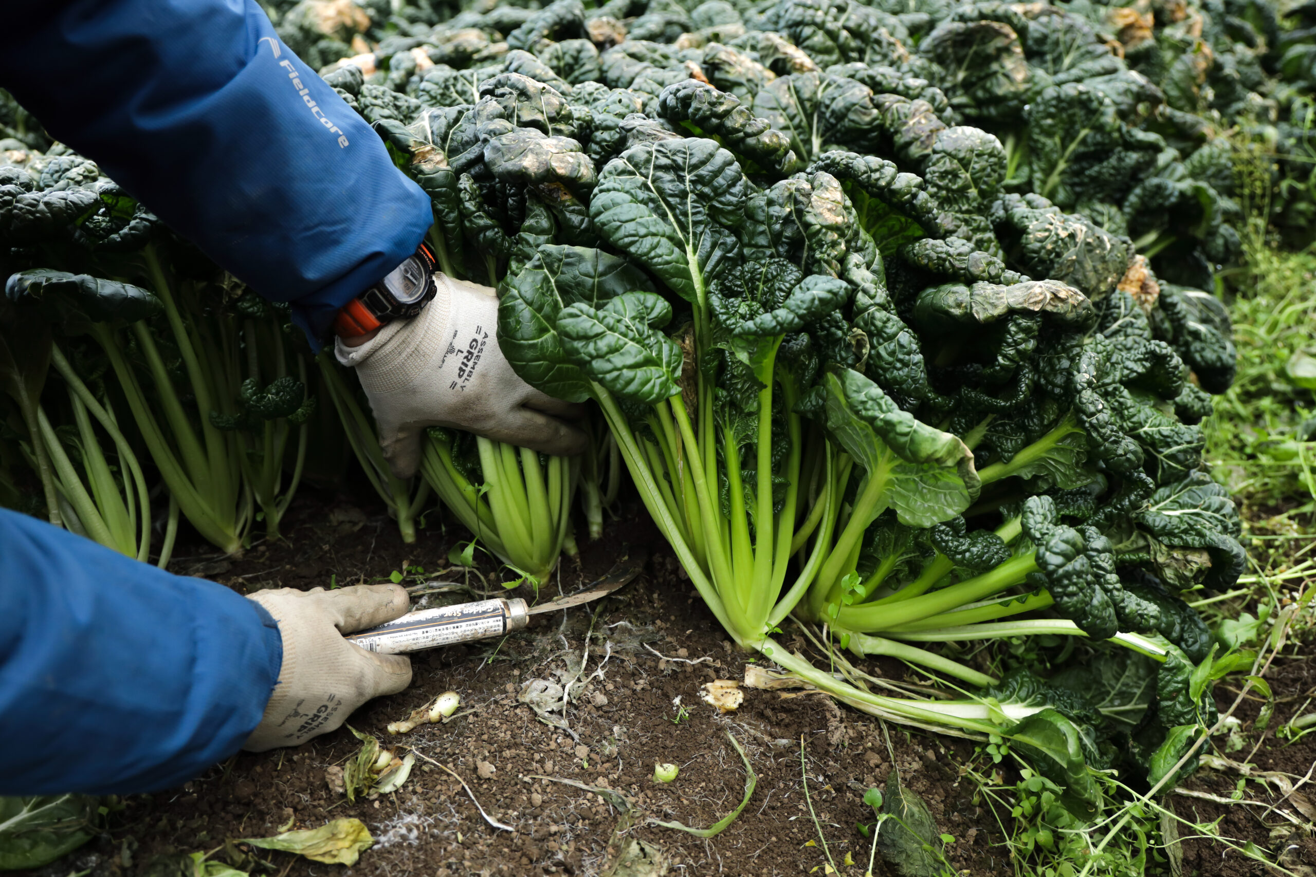 経験豊かな先輩のサポートのもと、ちぢみ雪菜を栽培