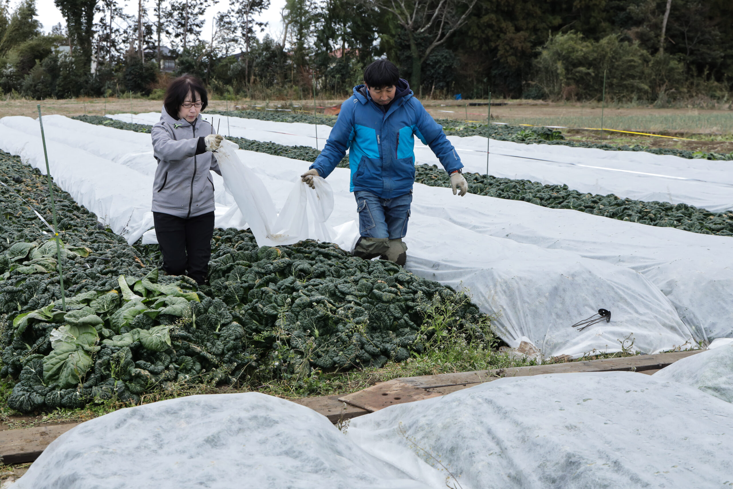 今にも雪が降り出しそうな厳しい寒さの中、畑に掛けられた鳥よけシートを外し、大ぶりの葉をつけた「ちぢみ雪菜」を収穫していたのは、伊深さんご夫妻。「朝は雪菜が凍ってしまうこともあるので、午後一番に収穫するんですよ」と穏やかな人柄そのままに、やさしい口調で教えてくれたのは夫の光さんです。
