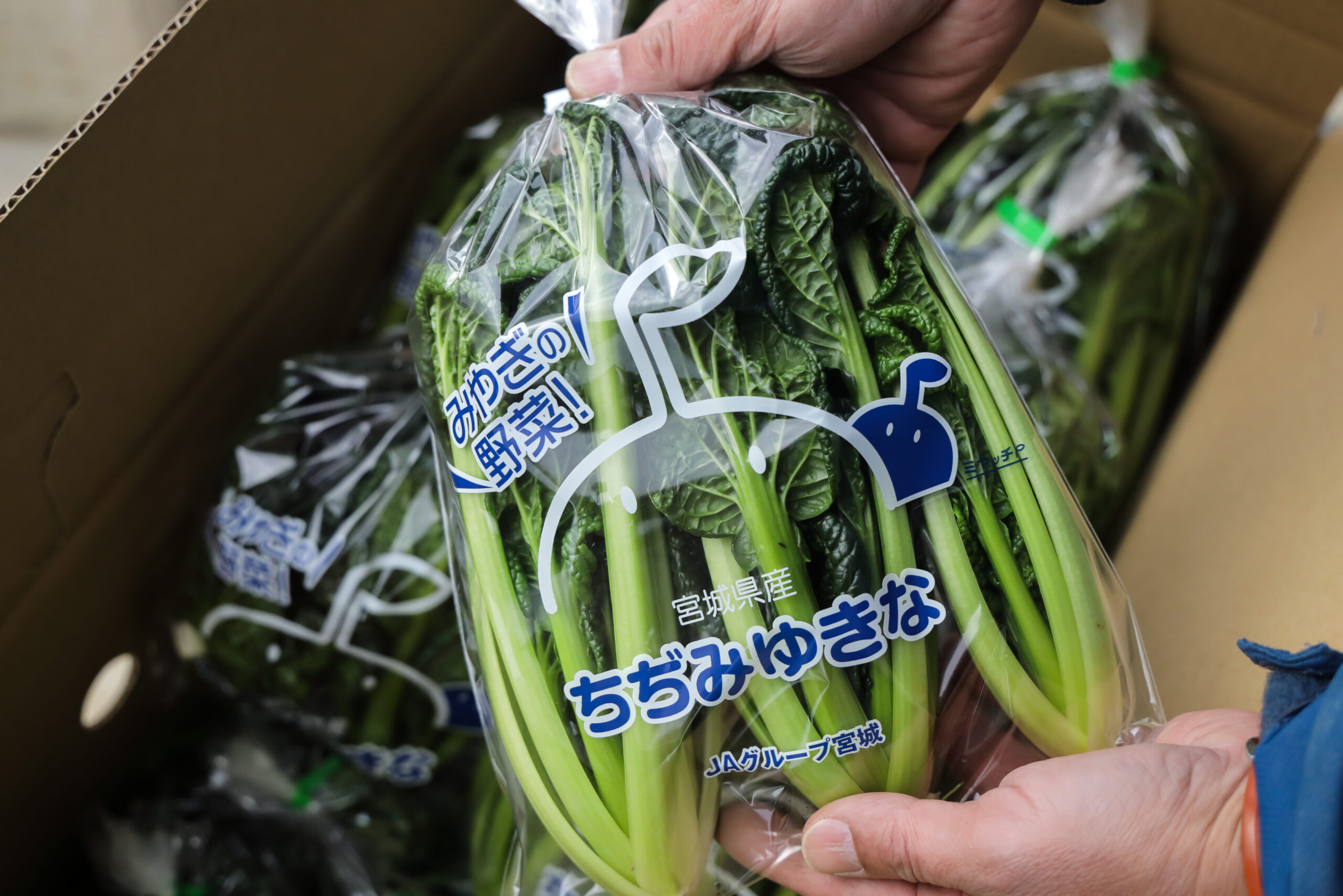 光さんは未知子さんとともに、仙台市太白区四郎丸地区にある畑で、ちぢみ雪菜を栽培しています。収穫時はとても大きい雪菜ですが、店頭に並ぶ時には、外側の葉を取るため、小さくなっています。「少しでも傷んだ葉は取らなきゃいけないんですが、それも普通においしいんですけどね」と未知子さん。12月後半から3月までの市場の開場日には、ちぢみ雪菜が約25株入る段ボールを15箱ほど出荷しているといい、「収穫はすべて手作業です。出荷が始まると、あまり休みがないので大変なんですよ」と語りました。