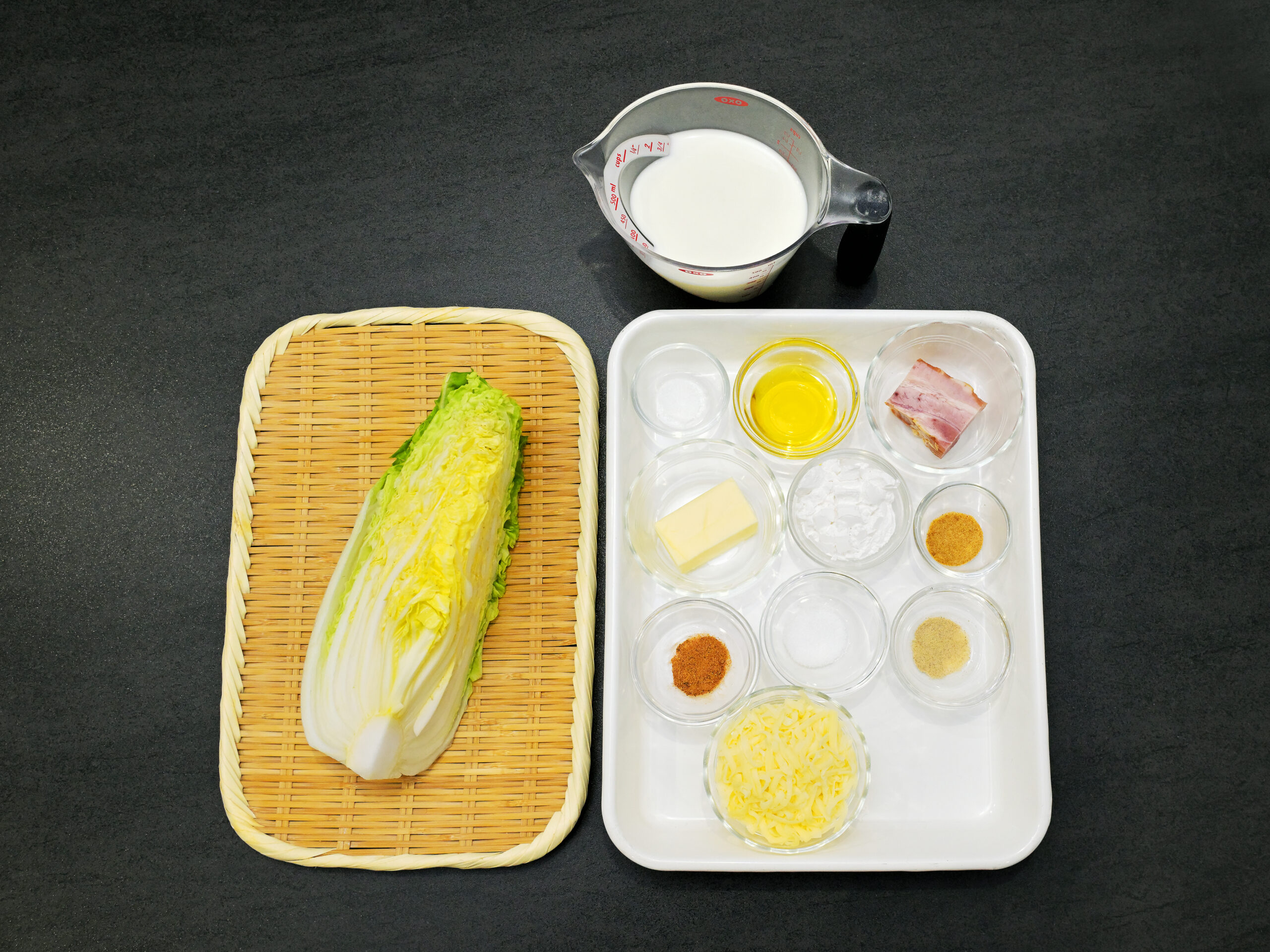 フライパンにバター、米粉を加え、全体がまとまってきたら、少しずつ牛乳を加えながらよく混ぜる。とろみがついてきたらコンソメ・ナツメグ・塩・こしょうで味を調える。グラタン皿などの耐熱容器に①を入れ、白菜の上に②をかけ、ピザ用チーズをのせる。200度(予熱なし)のトースターで5~8分加熱して完成。