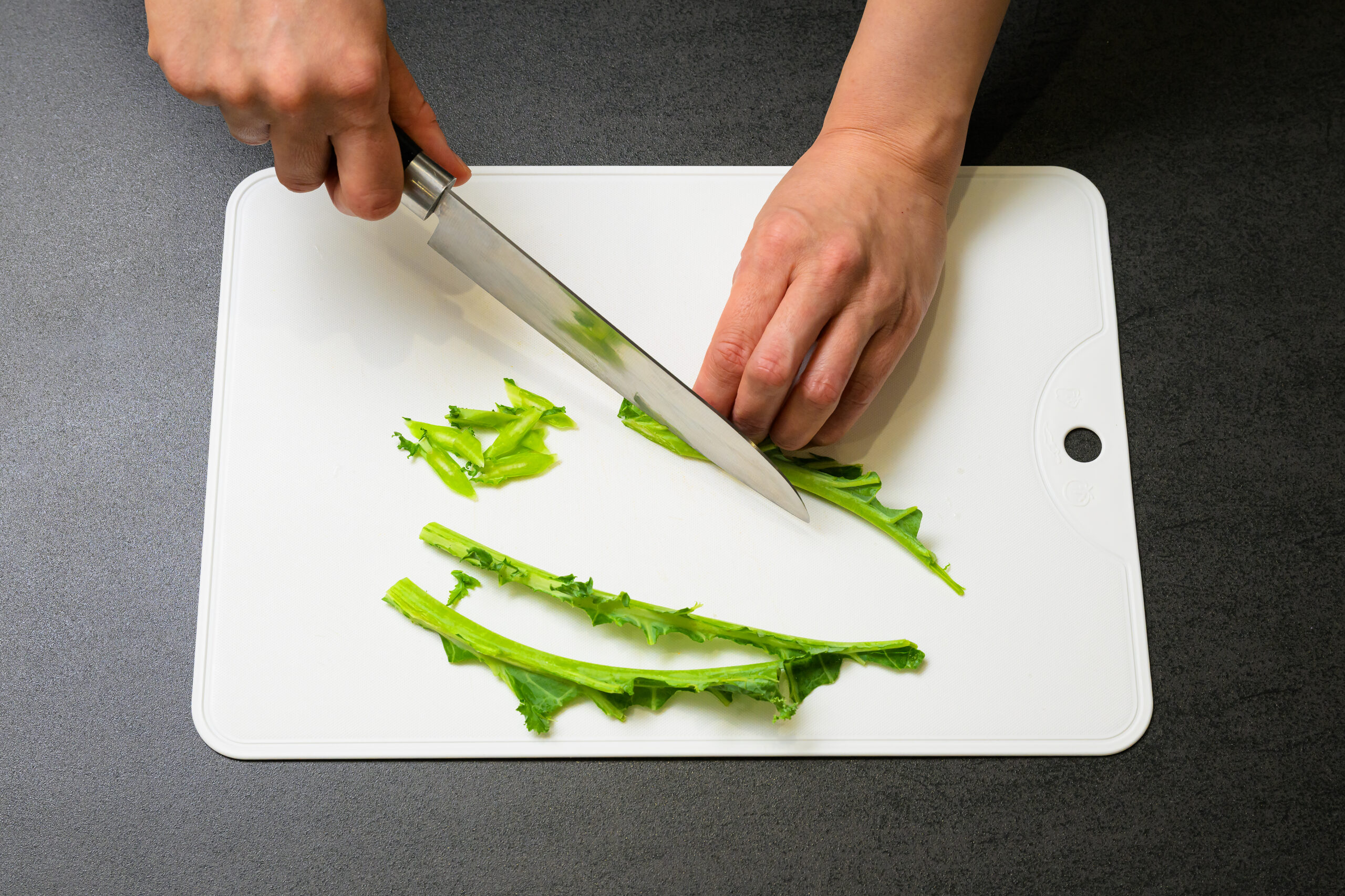 カリーノケールは軸から葉を外し、一口大にちぎる。茎は斜め薄切りにする。