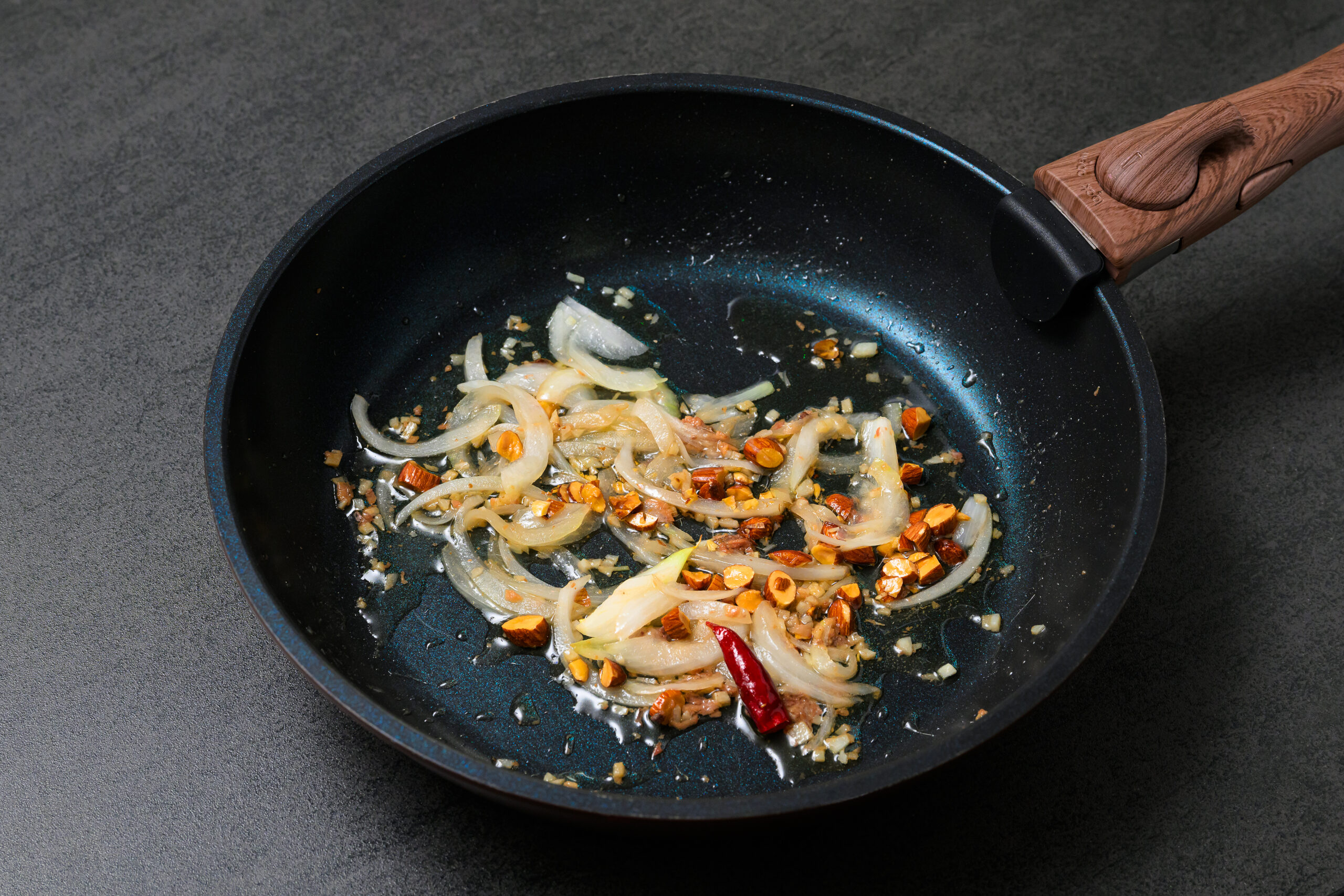 フライパンにオリーブオイル、にんにく、赤唐辛子を入れ、弱火にかける。香りが出てきたらアンチョビを加えて、木べらなどでアンチョビを押し付け、粗めのペースト状になるように炒める。さらに玉ネギとアーモンドを加え、玉ネギがしんなりするまで中火で炒める。