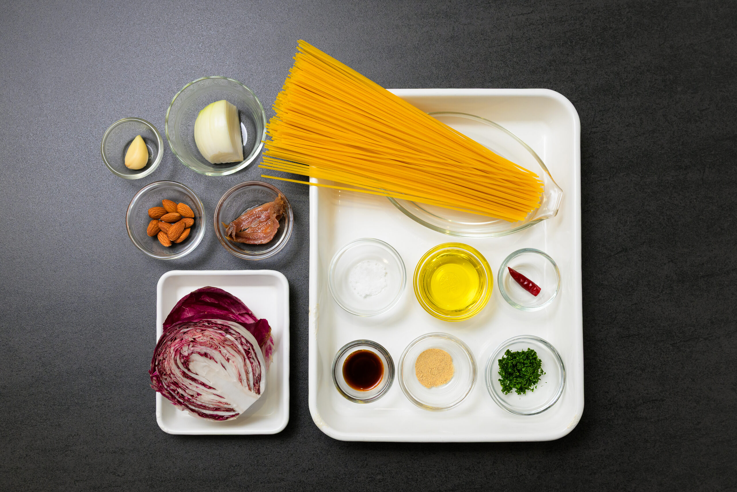 トレビスは芯を取り、ザク切りにする。にんにくは粗みじん切り、玉ネギは縦に薄切りにし、赤唐辛子は種を取る。アーモンドは粗く刻む。