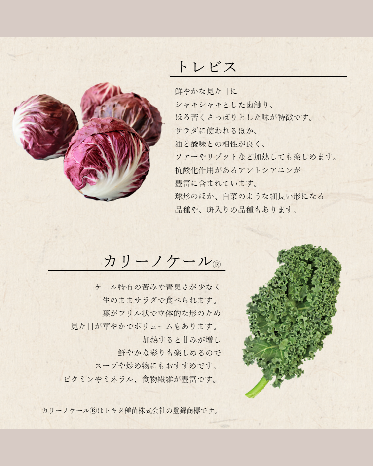 主役となった西洋野菜「トレビス」と「カリーノケールⓇ」についてご紹介します。