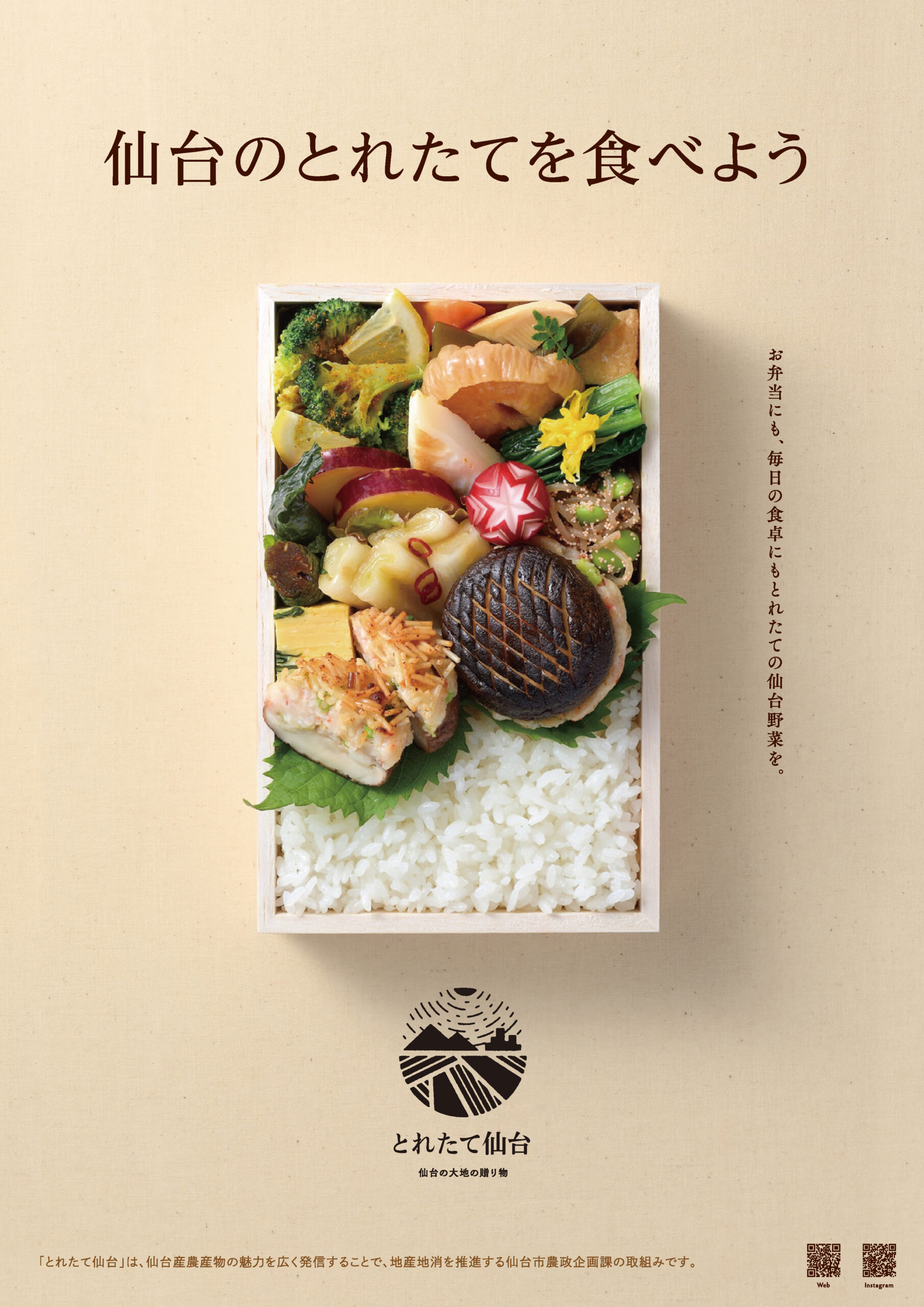 とれたて仙台の新しいポスターが完成しました。ポスターのお弁当は仙台在住のフードコーディネーター、岡本恵さんによるもので、仙台産の原木しいたけや仙台井土ねぎ、ブロッコリーなど、仙台の食材をふんだんに使った11品の料理が並び、まさに仙台の「とれたて」が詰まったポスターとなっています。